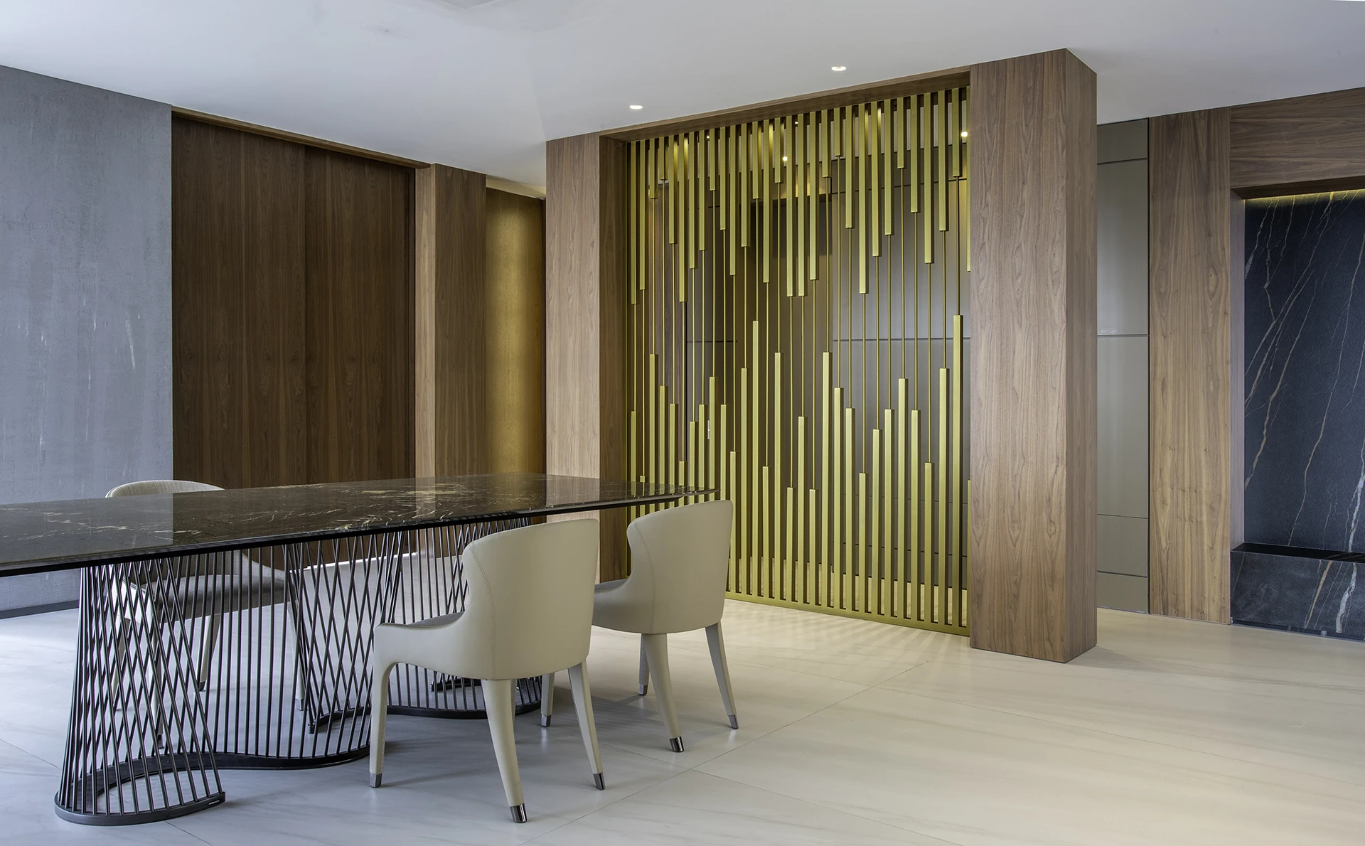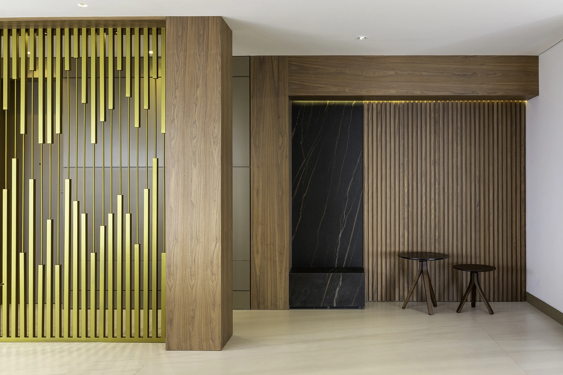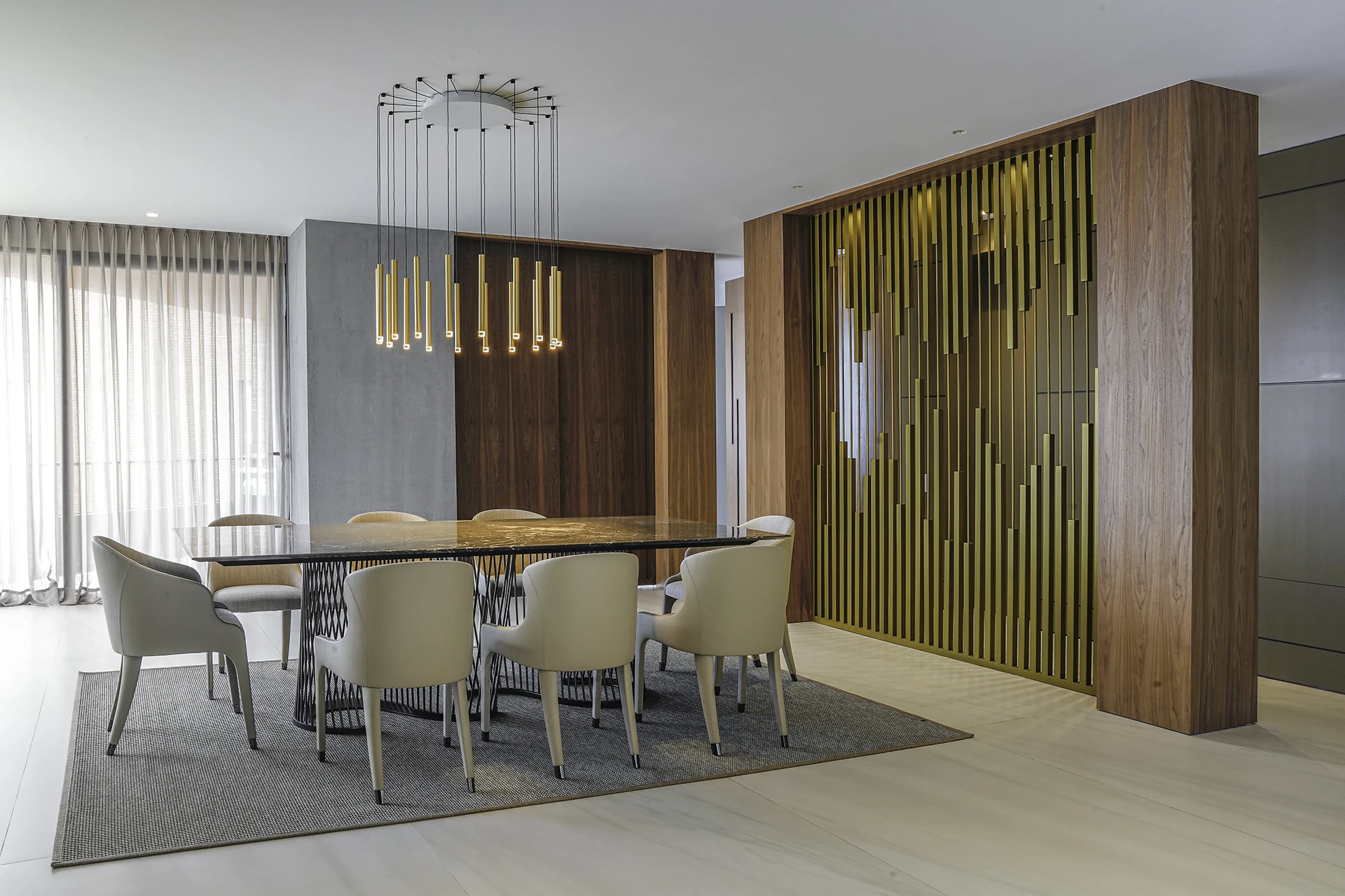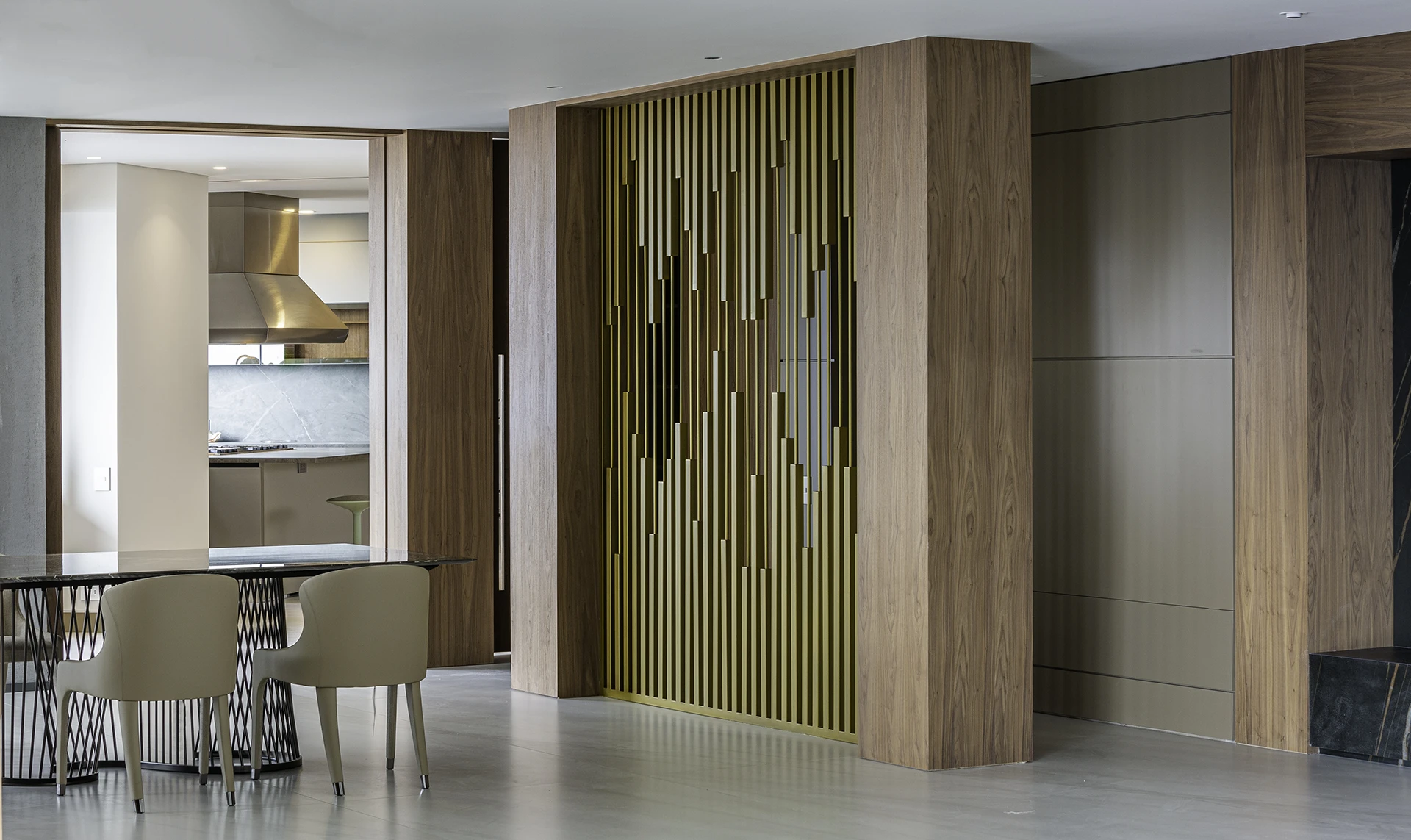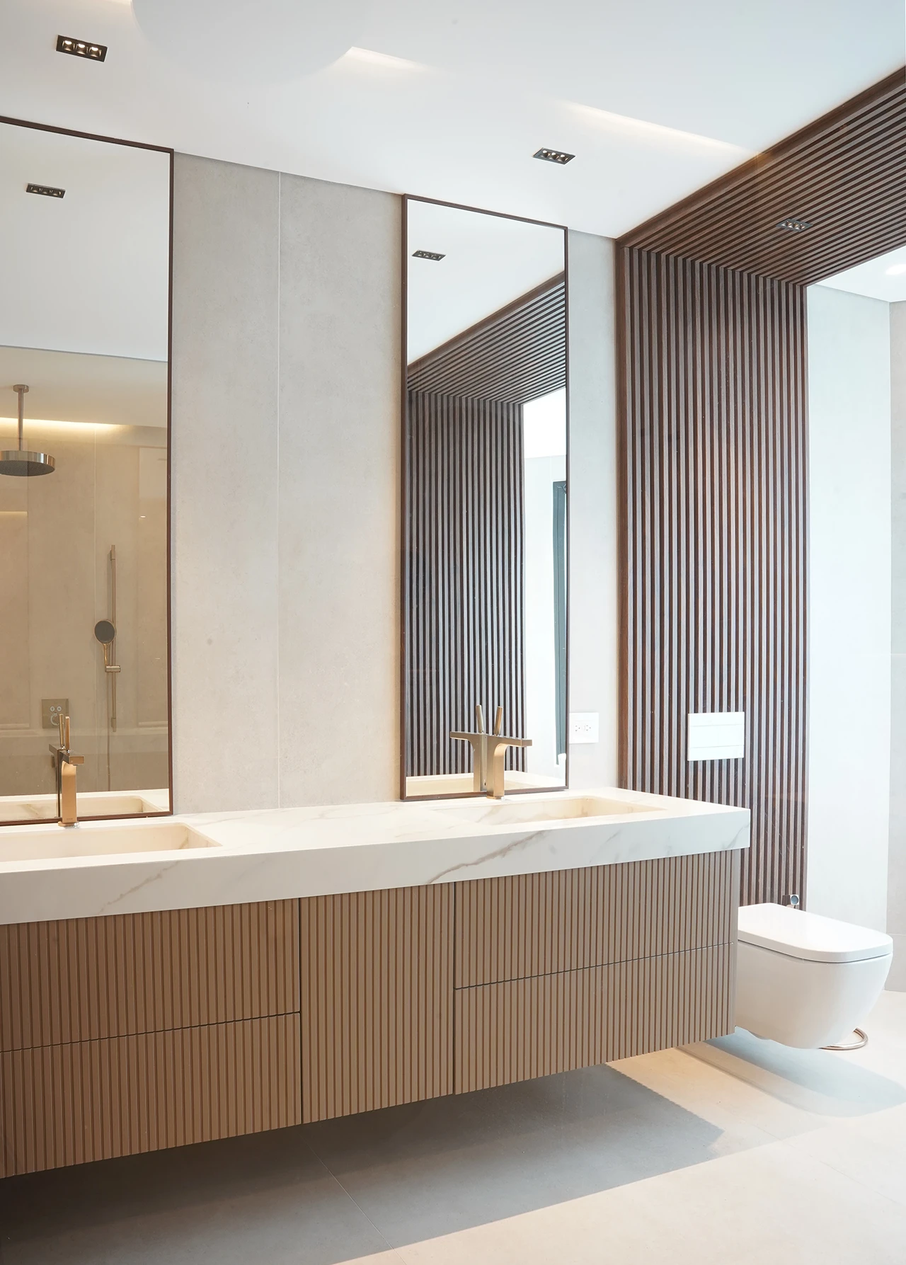 La calidez de la madera, la sutileza de las texturas naturales y el brillo contemporáneo de las celosías doradas se combinan para crear atmósferas sofisticadas y acogedoras, reflejando el sello distintivo de Esencial Arquitectura: el equilibrio entre diseño, luz y materialidad.
