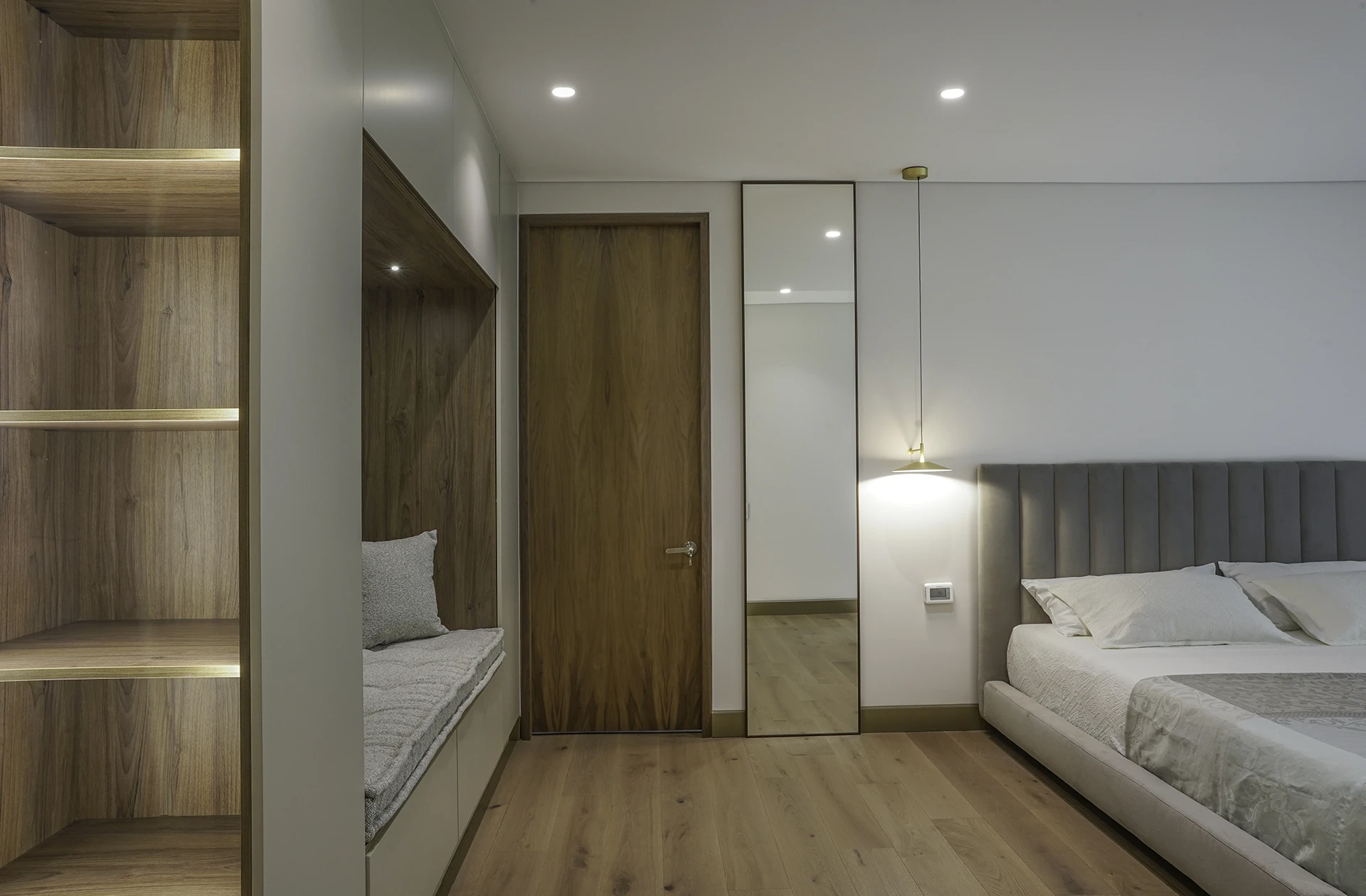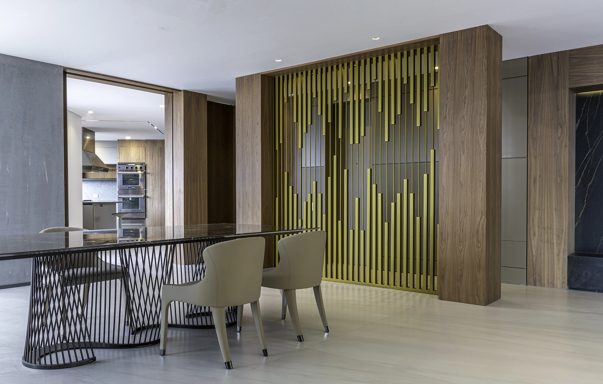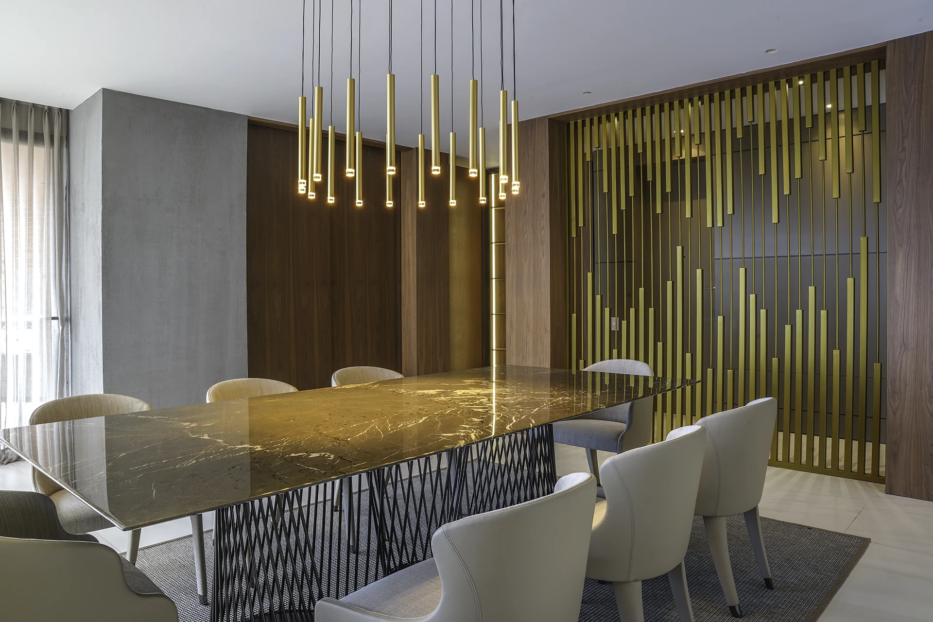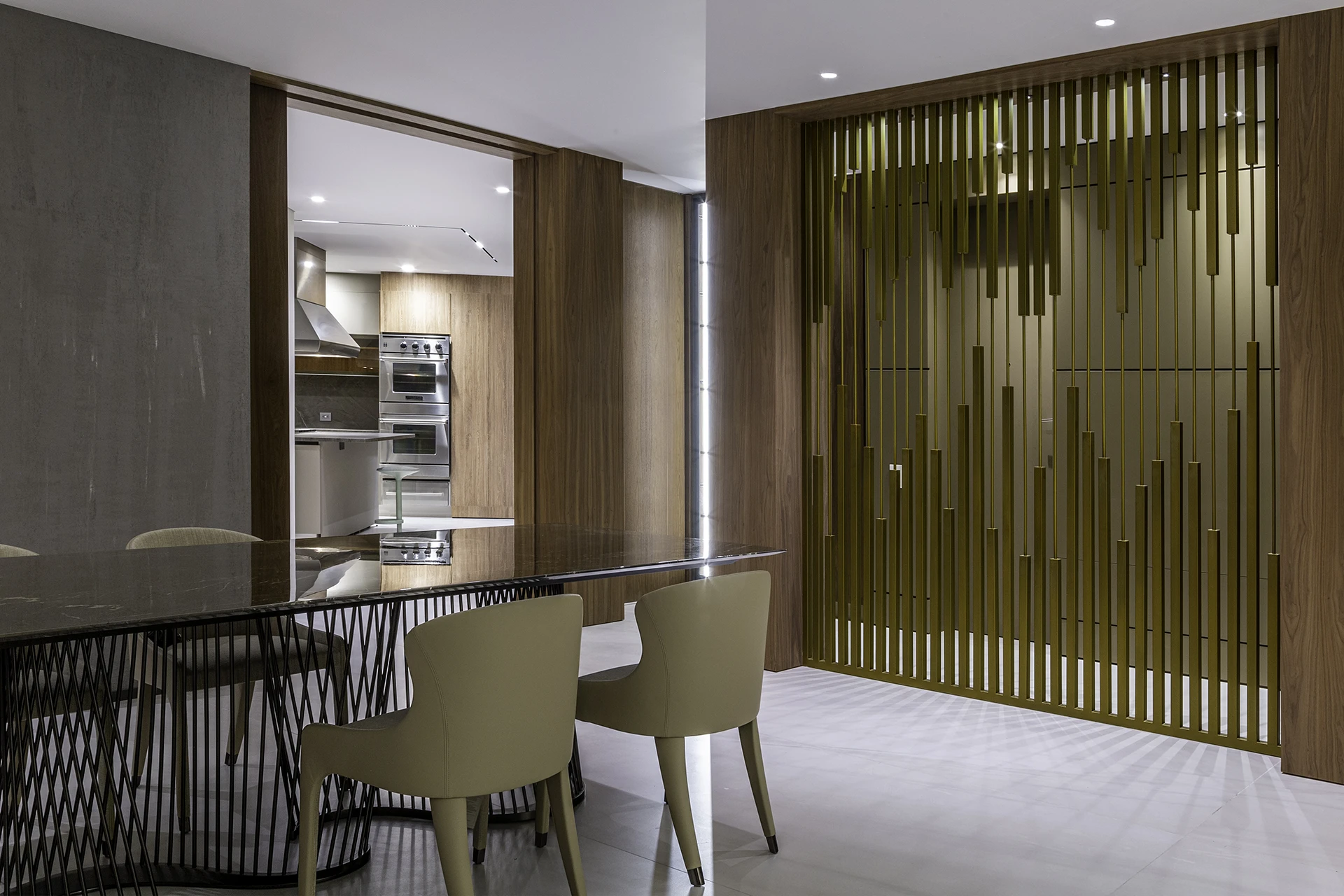 La calidez de la madera, la sutileza de las texturas naturales y el brillo contemporáneo de las celosías doradas se combinan para crear atmósferas sofisticadas y acogedoras, reflejando el sello distintivo de Esencial Arquitectura: el equilibrio entre diseño, luz y materialidad.