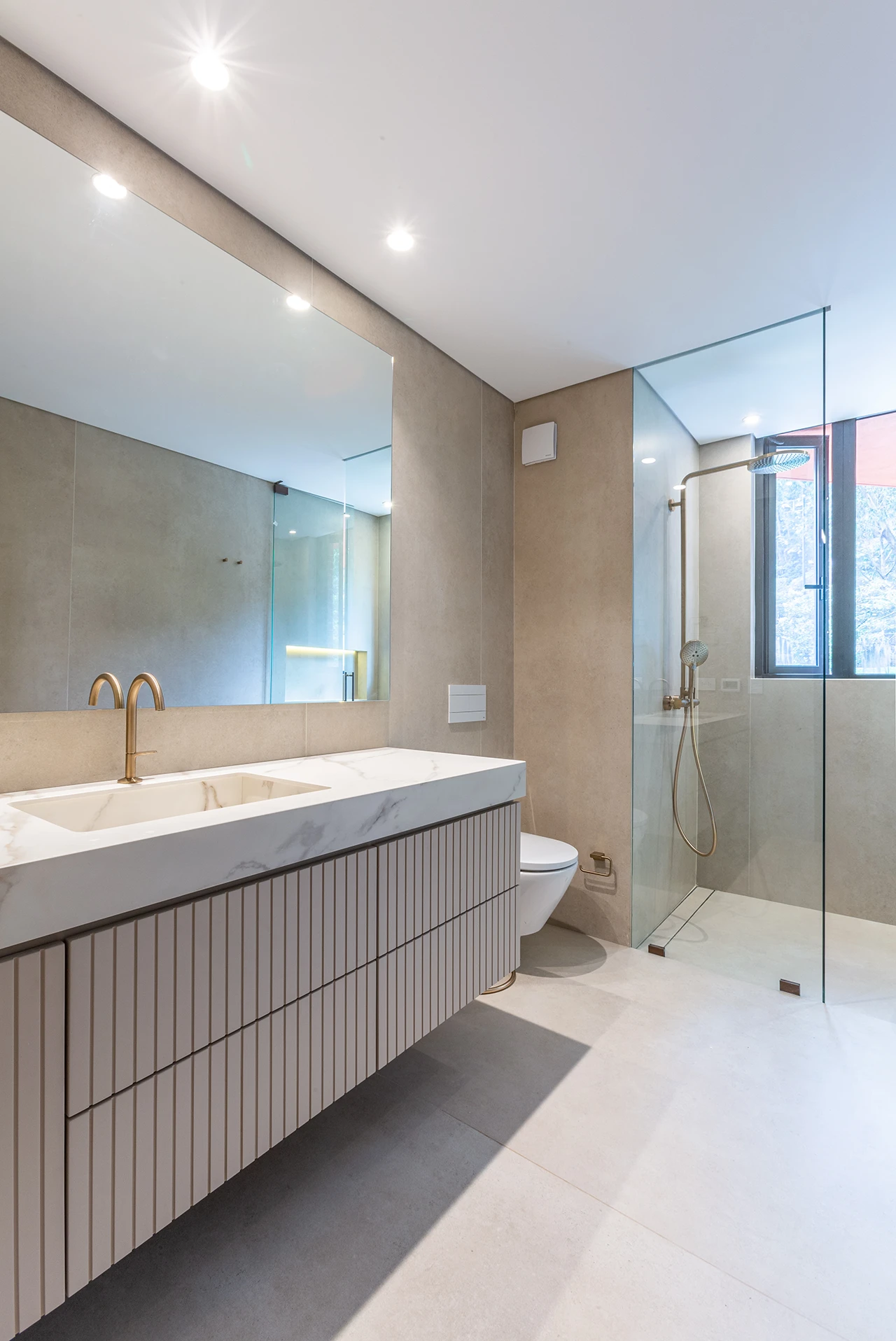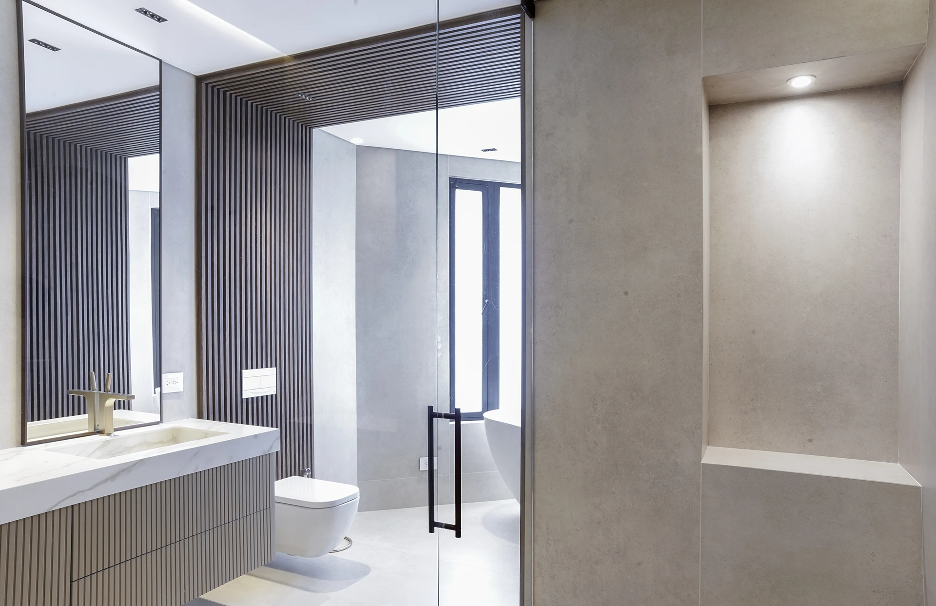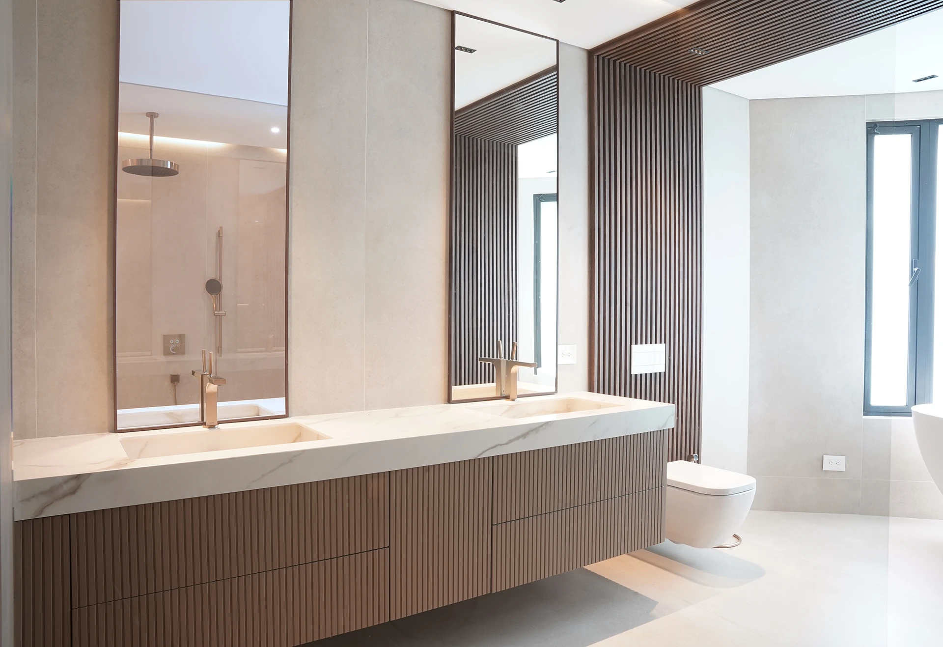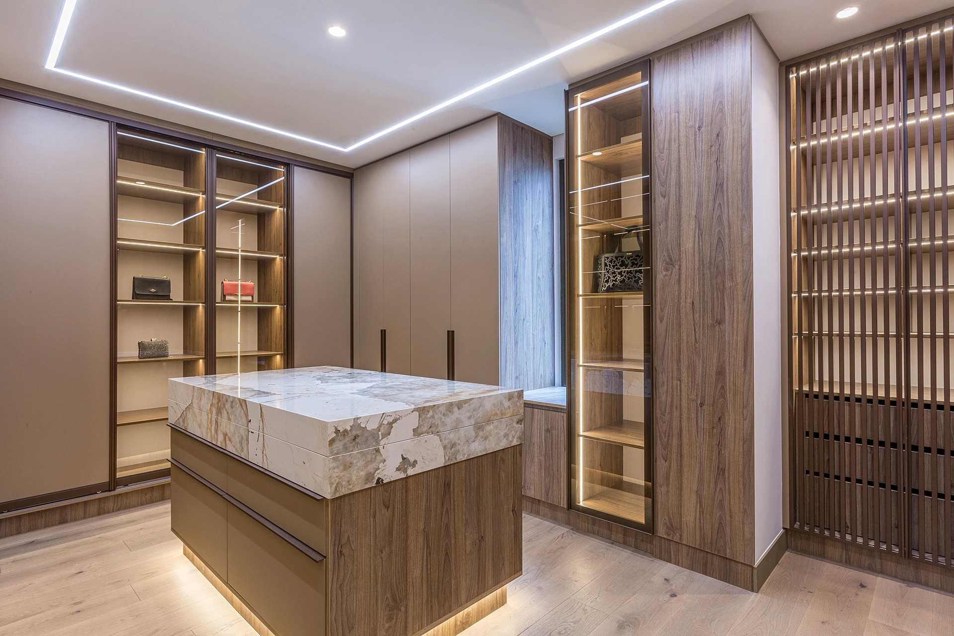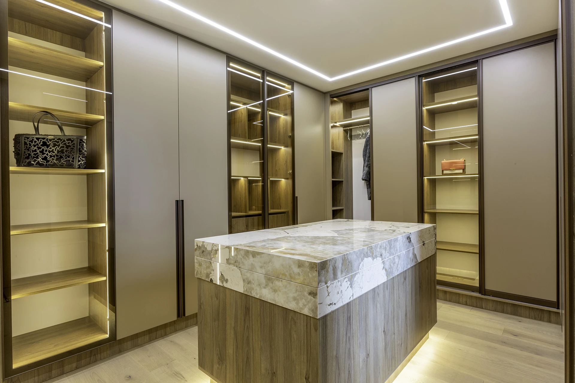 La calidez de la madera, la sutileza de las texturas naturales y el brillo contemporáneo de las celosías doradas se combinan para crear atmósferas sofisticadas y acogedoras, reflejando el sello distintivo de Esencial Arquitectura: el equilibrio entre diseño, luz y materialidad.
